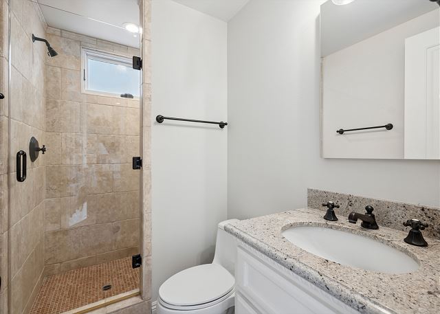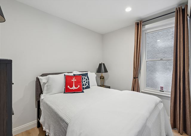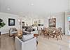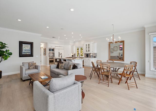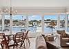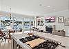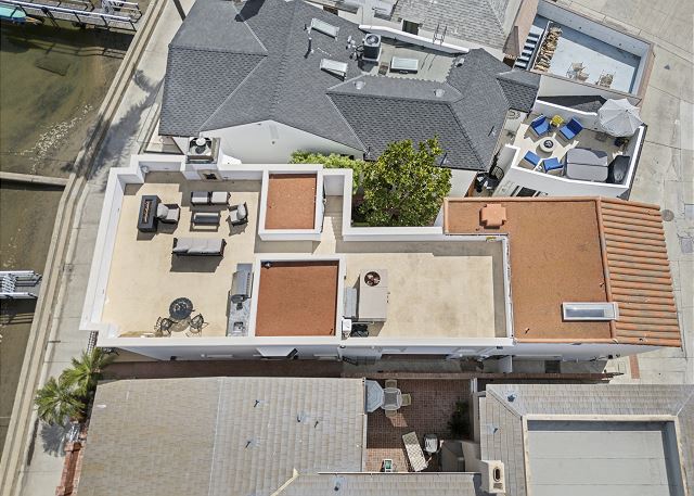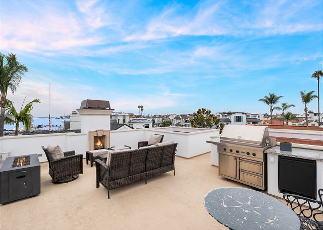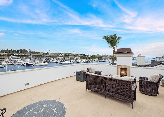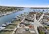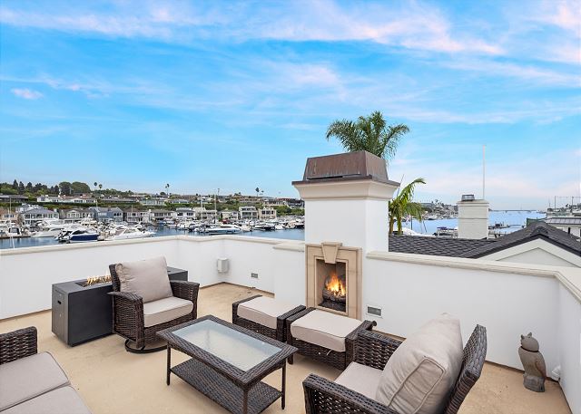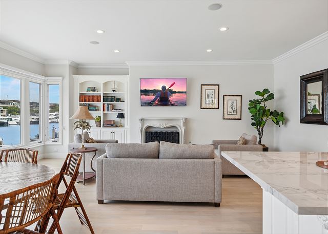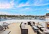 Downstairs offers convenient bedrooms and living area, while the second level takes full advantage of the views. Featuring a cozy living room with fireplace, dining space, and a chef's kitchen with a generous island made for gatherings. Head up to the third floor and you'll find the showstopper: a spacious rooftop deck with panoramic views of the bay, jetty, and even the magical holiday boat parade.